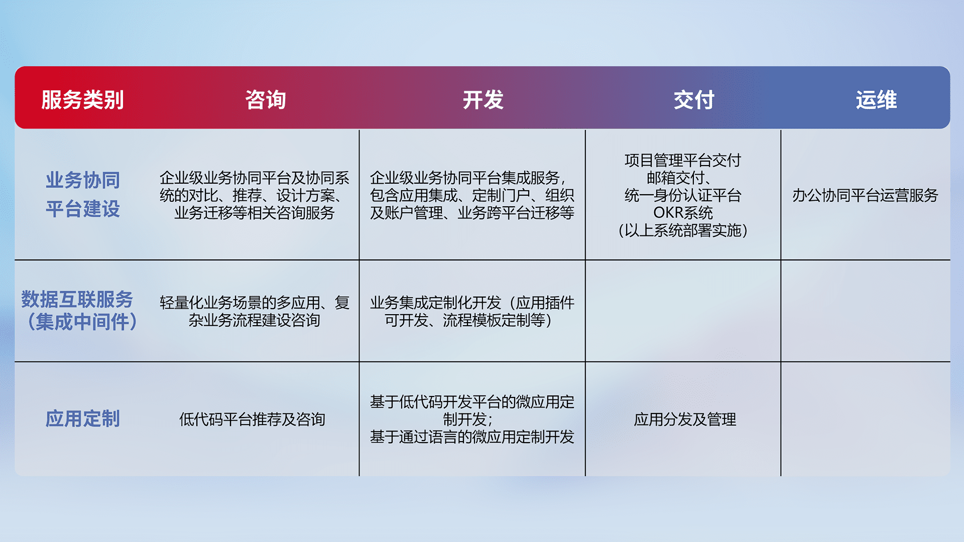 针对钉钉、、企微、、、IDaas等平台级产品提供产品的规划、、方案、、交付、、、、定制化开发等服务,,,实现如统一协同办公、、智能客户服务、、、混合会议管理、、、智能数据查询、、、、等业务场景,,实现数字化转型。。。